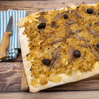 Préchauffez le four th. 6/7 (200 °C). Etalez finement la pâte à pizza. Coupez-la en carrés et déposez-les sur une plaque graissée. Etalez les oignons tiédis sur les carrés de pâte, disposez les anchois et enfournez 10 min environ.