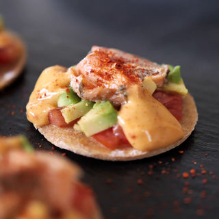 Une fois cuits à la plancha, nous avons garnis nos blinis basques avec quelques dés de tomates et lamelles d’avocat, un peu de filet de truite et enfin 3 petites pointes de mayonnaise au piment d’Espelette.
